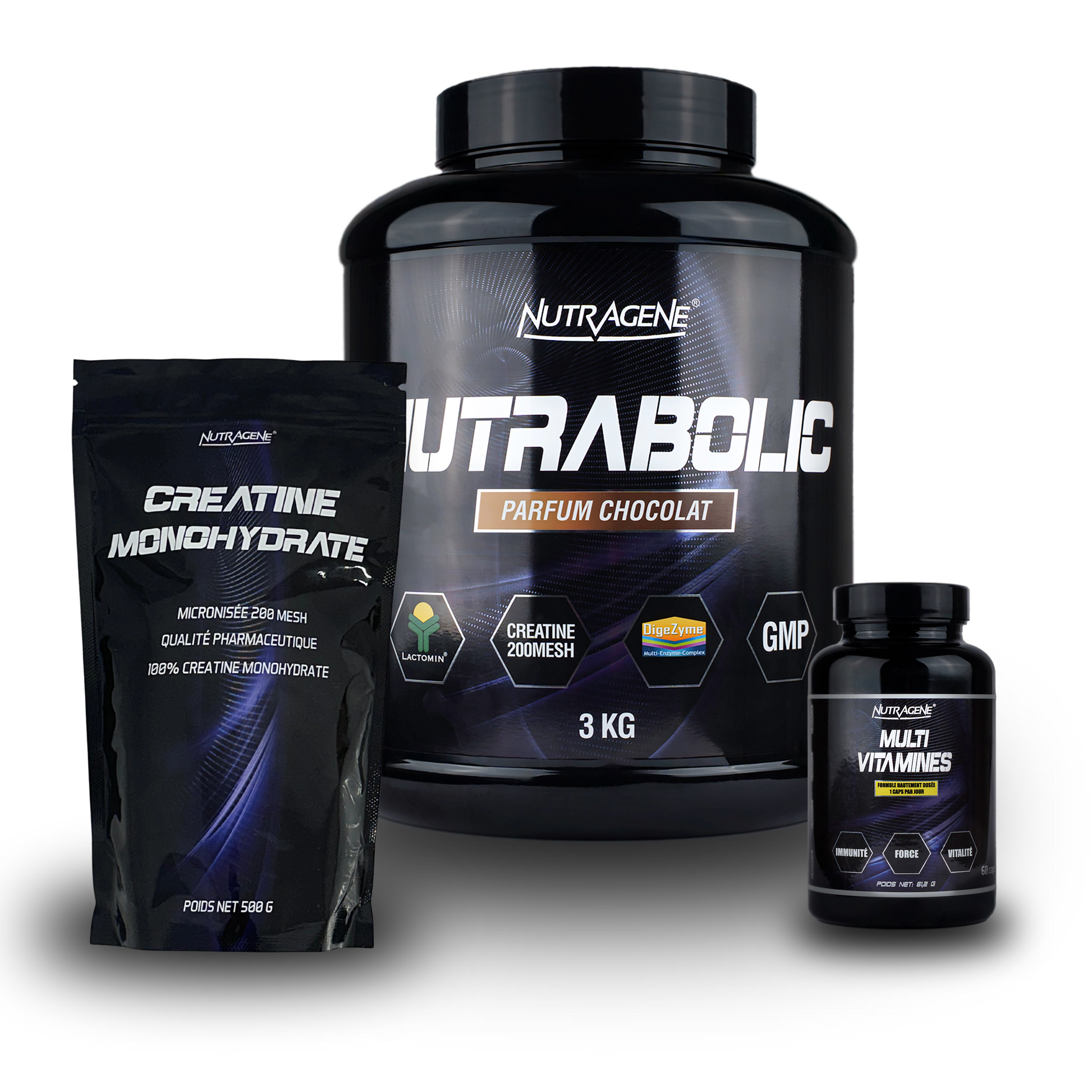 Le Pack PRISE DE MASSE Nutragene® est pensé pour t’aider à prendre du poids utile et du muscle de qualité. Il combine un Gainer riche en calories et protéines pour ton surplus quotidien, de la Créatine monohydrate pour booster ta force et ta performance, et des Multivitamines pour soutenir l’énergie et l’immunité.